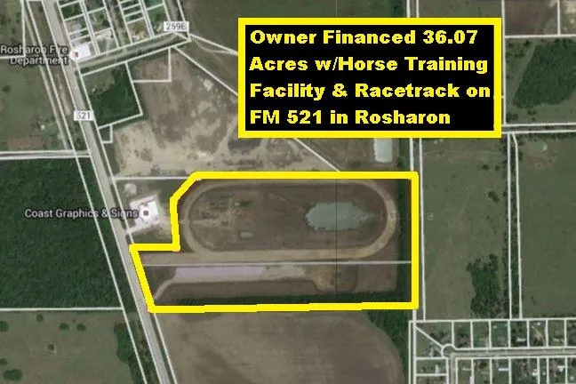 Owner Financing or Lease Option Available! 36+ Acres Horse Training Facility & Racetrack w/425 ft FM 521 Frontage in Rosharon. FM 521 is Busy 4-Lane Road Traveled by Commuters to TX Medical Center/Downtown Houston. All Amenities & Improvements Included for $20,000/Acre: 3000 ft Oval Racetrack w/Starting Gate, 80x90 Metal Barn w/11 Stalls & Two 12x12 Washracks, Metal Bleachers For 300 Spectators, Four 7x7 Concession Stands, 36x16 Covered Stage Area, 12x12 Watch Tower, Several Acres of Grade Level Parking, One 12 ft Deep Lake & 3 Smaller Lakes Totaling Several Acres. Has Electricity, Water Well & Community Water to Front Property Line on FM 521. Not in Floodplain (see Flood Map under pictures). Survey Available. Great Location Minutes to TX-288, TX-6, Proposed Grand Pkwy, Horse-Loving Suncreek Ranch/Estates & Manvel/Pearland. 15 miles to 7 Master Planned Communities. 30 Miles to Houston Downtown, TX Medical Center, Hobby Airport, Sugarland & 3 Universities via FM 521, Sam Houston Tollway, Beltway 8 & TX-288. Lease Option is $3500/Month! Co-Broker is Keith Jaehne. Contact Heidi for Details or To Make an Appointment!