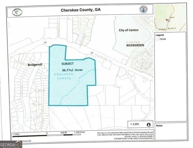 36.77 +/- Acres in Prime High Traffic Location with over 450' Frontage Along Ga. Hwy20 just West of the fast-growing City of Canton. Great Location for Commercial and/or Residential Development. Located 1/2 mile West of the Signalized Intersection at SR 20 (Knox Bridge Hwy), Butterworth Road & Rivergreen Avenue. Property adjoins the Bridgemill mixed-use development and has easy access to I-575 Exit 16 and 14. Sewer is located on the North side of Ga. Hwy 20 near the property. Look for sign on property.