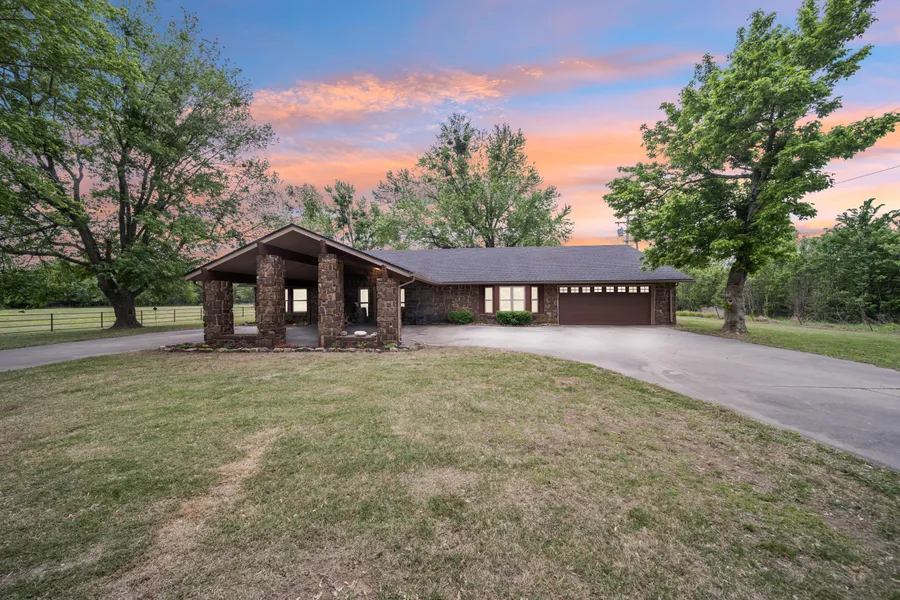Welcome to your dream ranch-style estate nestled on 5 picturesque acres of Oklahoma's lush countryside. This charming residence boasts a seamless blend of modern amenities and rustic elegance, offering a tranquil retreat for you and your family. Step inside this 4-bedroom, 3-bathroom sanctuary and be greeted by the airy open-concept living space adorned with vaulted ceilings and halo can lights, creating a warm and inviting atmosphere. Meticulously updated within the past 5 years, this home exudes timeless appeal and contemporary comfort at every turn. Entertain effortlessly in the spacious living/ dining/ kitchen combo, featuring beautiful hardwood floors, luxurious travertine tiles, and gleaming granite countertops accented by soft-close hinges. Unwind in the oversized master suite, complete with a lavish en-suite bathroom boasting a soaker tub and walk-in shower. Three additional generous bedrooms, along with a convenient jack and jill bathroom plus hall bath, provide ample space for family and guests to feel right at home. Enjoy the convenience of a 2+ car garage with a sink, complemented by a drive-through carport for added versatility. With multiple access points to the expansive back patio, indoor-outdoor living is seamlessly integrated into your daily lifestyle. Outside, the 5 acres is fully fenced with additional pipe fence surrounding the house, ensuring privacy and security. A storage shop equipped with power and a water spigot offers endless possibilities for hobbies and projects. Conveniently located off HWY 69 between Wagoner and the Muskogee Turnpike, this idyllic retreat is just 7 miles from Wagoner, 9 miles from Muskogee, 17 miles from Broken Arrow, and a mere 25 miles from vibrant Tulsa. Embrace the best of country living with easy access to urban amenities, making this property the perfect place to call home. Don't miss your chance to experience the epitome of rural luxury living.