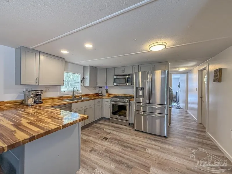 Welcome to this beautifully renovated single-wide mobile home nestled on a generous .42-acre lot in the heart of Pace. Perfectly located close to schools, shopping, the base, and just a short drive to Pensacola, this home offers both convenience and comfort. Inside, you'll find a completely updated interior with fresh paint, new flooring, modern fixtures, and stylish butcher block countertops throughout. The kitchen is equipped with new appliances, including a gas stove. Both bathrooms have been fully remodeled with a contemporary touch, and the home includes an on-demand water heater for added efficiency. The metal roof provides long-lasting durability, and while the AC unit is from 2013, it's been well-maintained and runs great. Outside, you’ll love the 12x10 shed, which is in great shape—ideal for storage, or workshop. This home is truly move-in ready—ideal for first-time buyers, downsizers, or anyone looking for an updated home with room to breathe.