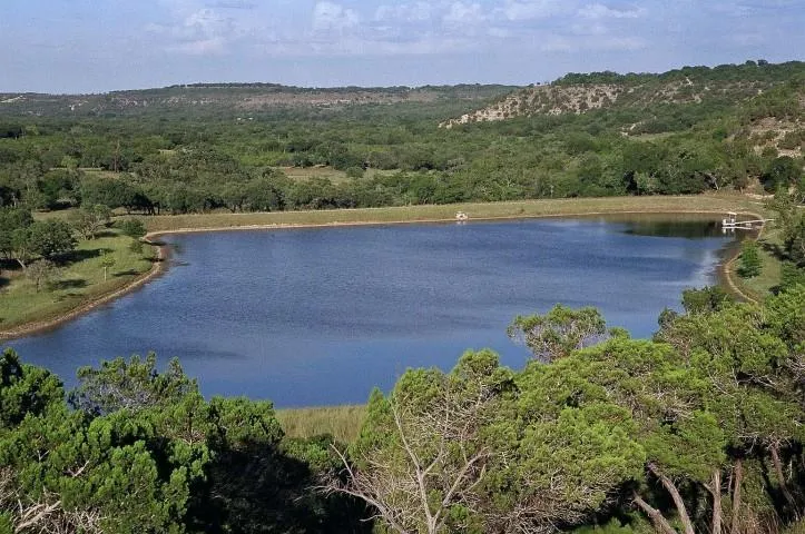 WATER: A major league lake of 7.5 acres is located in a stunning setting in the northern valley of the ranch, and it has been observed to be drought-proof, maintaining a depth of over 20 feet and a surface area of 7 acres during the dry spell ending in 2006. This is, without question, one of the finest lakes in the Hill Country, and offers boating, floating, swimming and fishing in a secluded setting surrounded by cliffs and towering ridgelines. The lake record bass is 9 lbs., and there is a swimming/fishing floating dock allowing good access.