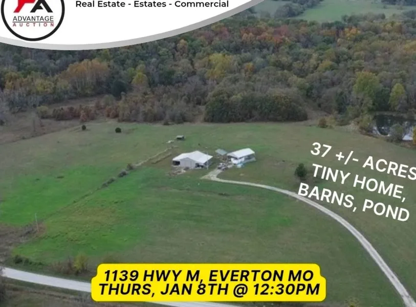 Advantage is honored to present this of Home, barns, and 37 acre parcel in Everton MO Highlights: Investment potential Building sites Large pond Quiet area LOT DETAILS Location of Land: 1139 Hwy M Everton MO Directions to the farm: Location of Auction:Bidding is online at AuctionMO com. Preview available anytime. Date of Auction: Jan 8th at 12:30 pm CST Legal Description: Taxable Acres: 37 Estimated Taxes:$600 Estimated Pasture Acres: AuctionSales Method:The real estate will be offered as 1 tract of land. EarnestPayment:Earnest money in the amount of ten (10%) percent of the contract price shall be due with the acceptance of the offer. Thepaymentmaybein theformofacashier'scheck,personal check, companycheck,orwiredfunds. Earnest money will be deposited in theReal Estate Trust Account of the seller's attorney. Closing:The sale closing is on tbd , or such other date agreed to by both parties. Certified funds will be required at the time of closing for the remaining balance of the purchase. The balance shall be paid in the form of certified funds upon closing. Possession:Possession will be granted at closing, or such other date agreed to by both parties.