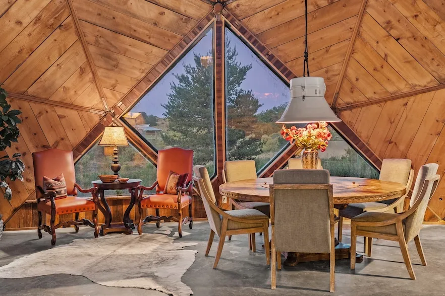 At the end of the road, you will find a singularly unique property in all of Northern New Mexico. This whimsical dome is sure to inspire! Lovingly built in the 1970's, this 3 bedroom, 2 bathroom property has been a place of gathering and community building for many years. A very spacious open concept living area provides kitchen, living and dining spaces with high ceilings and lots of natural light. The wooden ceilings provides a warm ambience. There is one large bedroom and a 3/4 bath downstairs. Upstairs you will find a full bath and one bedroom, plus an additional space for an office or flex room. There are so many possibilities with this beautiful land. Outside, new roof coating has been put on in the last few years. There are plenty of options for projects, horses, cattle or just hanging out by the bonfire and looking at the stars. There is a 720 square foot artist's studio on property, which has been an incubator for some of Santa Fe's great local artists. This property is a short walk to BLM land with many hoodoos and other interesting rock formations. Hiking, riding and enjoying the great outdoors is easy from this gem of a property. Don't miss the opportunity of a lifetime, schedule a showing today!