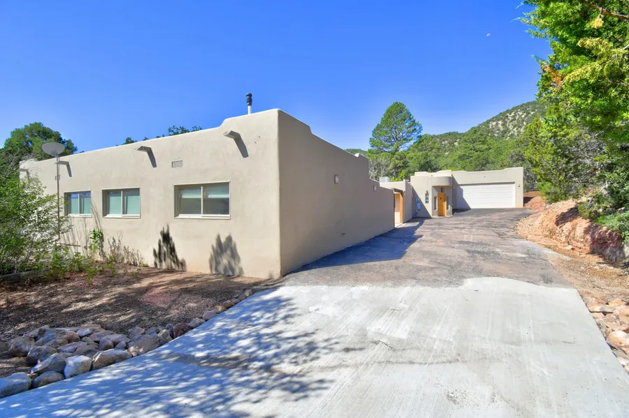 Wonderful East Mountain home on Private, Peaceful, Wooded 2 Acres just 11 Minutes to ABQ! So Convenient yet So Serene! Sundrenched and Open House has been Completely Redone (All NEW Kitchens, Baths, Flooring, Lighting, Drywall, Stucco, Roof, HVAC +++! Huge New Trex Deck. New Low-E Jeld-Wen Wood Windows & Doors. Flexible Separate Wings Floorplan - Can be Main + In-laws quarters, 2 Living Areas or 2 Main Bedrooms...you choose! Ask LB for ideas and possibilities. Oversized Garage with work area. Large Entry/ mud room. Generous mostly blank slate courtyard. Gated at neighborhood entry and gated at house entry. Enjoy your secure natural getaway just minutes east of the city... Well and Septic. Propane leased, to be prorated at closing. R/O unit in kitchen. Very Special! A Must See!