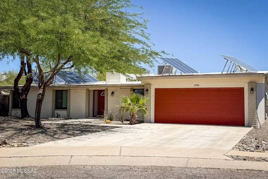 Fabulous contemporary home with pool & solar power! Step down front living room with wood-burning beehive fireplace. Kitchen makes a statement with matching stainless appliances, two tone cabinets, & custom poured concrete countertops. Also features island with breakfast bar & dining area. Huge family room with vaulted ceiling & dry bar is perfect for entertaining. Luxe master suite includes walk in-closet, jetted tub, dual sinks, & tiled shower. 3 more carpeted bedrooms & hall bath with combo tub/shower. Laundry room. Dual pane windows with blinds. Solar panels will save you a mint running the central A/C! Walled back yard has covered patio, putting green, and playset. Large pool surrounded by safety fence. 2-car garage with coated floor. Tucked away in a quiet cul de sac with no HOA!