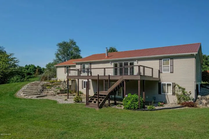 Delton- Acreage & Privacy. Own your piece of paradise! Located at the end of a dead end road this ranch walk out home is nestled on nearly 18 wooded acres.Features include 3 bdrm, all w/walk in closets/ 2 full bath, main floor laundry & hardwood floors. Spacious kitchen w/stainless steel appliances & slider door to new composite deck. A large dining room w/bay window overlooks the surrounding woods. Living rm has a stone, wood burning fireplace. The highlight is a 12' paneled glass door to the enormous deck! Walkout level has 2 additional bedrooms & full bath, French door to a patio, plus plenty of opportunity to finish as you like. The inground saltwater pool promises summer fun & entertainment! In addition the 30x40 pole building is ideal for yard equipment or workshop. The home & pole building have newer metal roofs! Many nice updates have been done for you. Ideal for the hunter, nature lover or just those who want to enjoy privacy! Close to town and Delton Kellogg Schools.