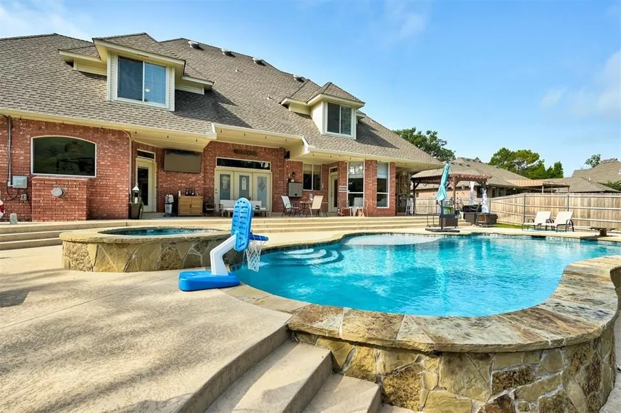 Welcome to your dream home! This beautifully remodeled 5 bedroom or 4 bed with bonus room, 3.5-bathroom home offers 3,979 square feet of luxurious living space designed for comfort and elegance. Four generously sized bedrooms with huge walk-in closets, provide ample space for relaxation and privacy. Downstairs the deluxe master suite is a true retreat, featuring a cozy remote control fireplace, a walk-in closet, and an en-suite bathroom with a soaking tub and separate shower. The master bedroom window offers a serene view of the pool. The master bath boasts high-end fixtures and finishes, while the additional full bathrooms are tastefully designed with modern amenities. The heart of the home, this chef's kitchen is equipped with top-of-the-line stainless steel appliances, soapstone countertops, a large walk-in pantry, and abundant cabinet space for tons of storage. Perfect for culinary enthusiasts and entertaining guests. The large living room with remote control fireplace and large windows that flood the space with natural light, informal breakfast area, informal living room, and kitchen area, create a perfect space for family gatherings and entertaining. An additional room that can be used as a home office, playroom, or guest bedroom, providing versatile living options to suit your needs. Step outside to a beautifully landscaped backyard, complete with a large pool, hot tub, and raised garden. The patio area is perfect for alfresco dining and summer barbecues. A stunning wood staircase with a black wrought iron banister leads to the upper level, adding a touch of elegance to the home. The second floor features three bedrooms and a game room/bonus room, offering additional living space and versatility. This exquisite home offers the perfect blend of luxury, functionality, and style. Don't miss the opportunity to make this your forever home. Schedule a showing today and experience the unmatched charm and sophistication of this remarkable property!
