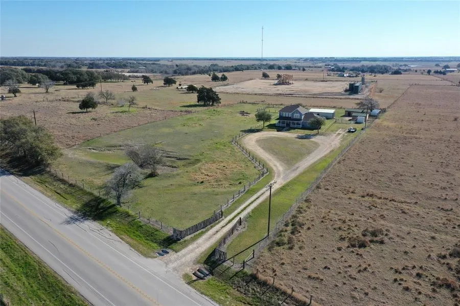 New to the market and won't last long. There is nothing similar offered in the surrounding area. This property is perfectly located, east and west approximately halfway between Houston and San Antonio, north and south puts it approximately halfway between Victoria and Austin. The property has a gorgeous view into the far distance of the rolling countryside. This two-story home was built in 2001 and features 4 bedrooms and 2 1/2 baths. A partial list of the many amenities; wood floors, large master bedroom with walk in closet and a master bath. The living area features an open floor plan connecting the family room, and kitchen with breakfast nook separated by an island. Just off the kitchen is a separate utility room with outside access, separate dining area for more formal occasions, and a half bath for guests. Upstairs you will find three bedrooms and a bathroom with great views of the western sky.
