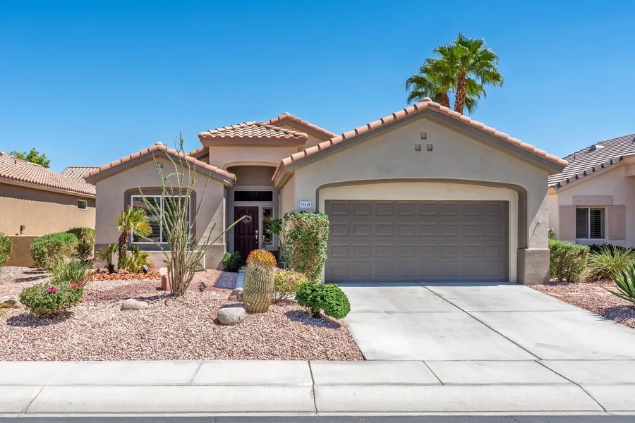 Sun City Palm Desert - St. Maarten. This sought-after St. Maarten greatroom floorplan offers 2 bedrooms, 2 bathrooms, plus a den. The spacious east-facing backyard features an extended patio with alumawood cover and lush desert landscaping for outdoor enjoyment. Updated exterior paint and vibrant flowering cacti enhance curb appeal. Inside, tile flooring extends throughout the main living areas, while the great room opens directly to the rear patio through sliding glass doors. The kitchen includes a chef's island with breakfast bar, Corian counters, a bright recipe window, and a pantry. Off the hallway, a generous den makes the perfect office or hobby space. The primary suite offers a bay window, large walk-in closet, and bathroom with sitting vanity and glass-enclosed shower. A guest bedroom with walk-in closet is adjacent to the full guest bath with tub/shower combo. Additional highlights include a laundry room with built-in storage, a 2-car garage with cabinetry, and a newer AC unit installed in 2019.