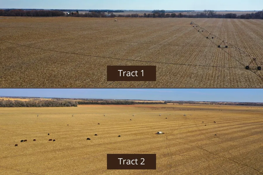 Tract 1 consists of approximately 119.75 acres and is priced at $886,150. This tract is well-suited for high-efficiency irrigated crop production and features a modern center pivot with a corner arm, maximizing irrigated coverage.