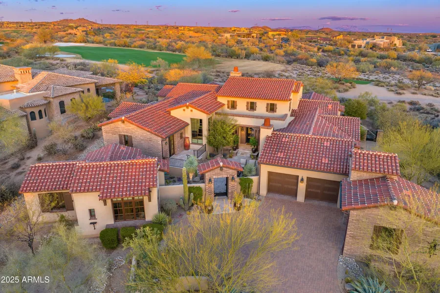 COVETED GOLF MEMBERSHIP AVAILABLE. Subject to club approval. Modern Classic Spanish Colonial-Style that blends with the desert setting. Light & Bright with high ceilings. Located on the #1 hole of the Tom Fazio designed Mirabel Golf Course. Walking distance to the clubhouse & amenities with panoramic views, large front courtyard w/fireplace. Single level with only 3 steps. 5050 sf, 4 BR's, 4.5 BA's. Included is a detached 2-room Casita w/kitchenette, plus Den+Office+3 Car Garage. 2 EnSuite BR's in main house plus primary. Open Greatroom floorplan with soaring ceilings, beams & seamless indoor/outdoor living. Interior details include wood plank & custom brick plus stone flooring, contemporary glass & wrought iron light fixtures + custom cabinetry. Chefs kitchen with Wolf 6 burner range ... 48" Subzero Fridge/Freezer, Bosch dishwater and walk in pantry. Walnut butcher block island & granite counter tops. 500 bottle wine room. Outdoor living area features a large cvrd patio, dining patio, heated pool/spa, fireplace & built-in BBQ station. Additional bonus items include Canterra metal front gate & courtyard gate, electric shades throughout, Savant home automation system plus custom metal air returns and vent covers. Furnishings available by separate Bill of Sale.