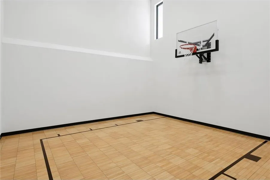 The finished lower level features a wet bar, media area, exercise space, and direct access to the sport court — ideal for year-round fitness or play. A three-car attached garage (~755 sq ft) and durable, energy-efficient construction deliver practicality and performance.