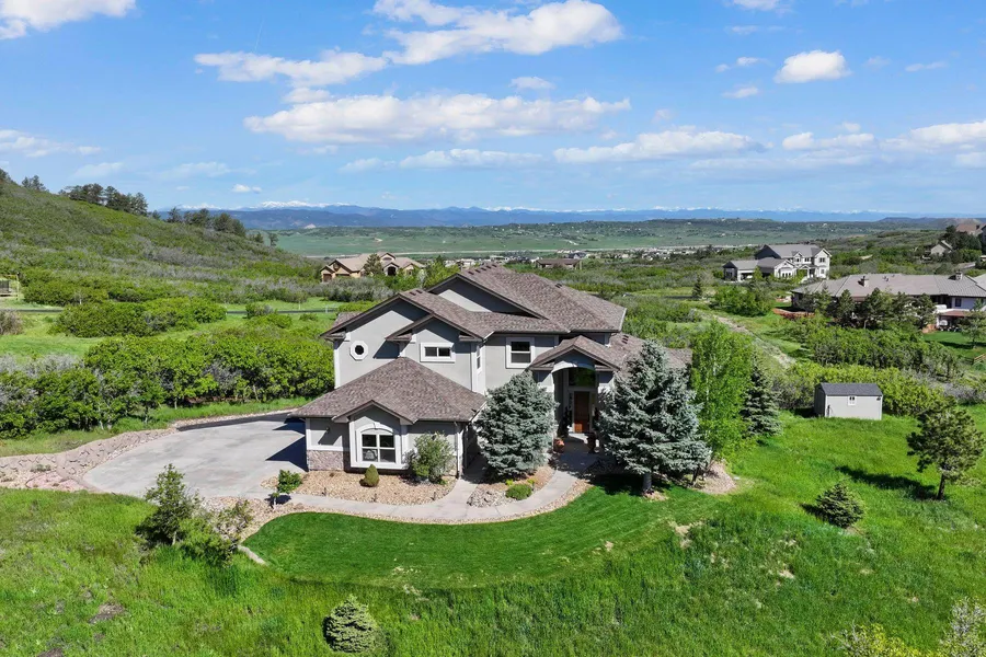 This exquisite residence, nestled on nearly 4 acres within a gated community adjacent to Bell Mountain Ranch, offers unparalleled Front Range views and an oasis of tranquility, surrounded by over 100 acres of open space. The home showcases impeccable design and craftsmanship, featuring gleaming Alder hardwood floors, a stunning three-story staircase, a home office, a main level guest suite, and a walk-out basement. The great room, graced by a soaring 20-foot ceiling and floor-to-ceiling stone fireplace, opens to the gourmet kitchen, with stainless appliances, Alder cabinetry, granite counters, and a walk-in pantry, making it ideal for both daily living and entertaining. For outdoor gatherings, a west-facing deck offers mountain vistas, and a lower-level patio is prepped for a hot tub. The owner's suite provides a luxurious retreat with a gas fireplace, expansive windows, and a deluxe 5-piece bath. The lower level offers a sizable rec room, a wet bar, and ample natural light. This idyllic property combines opulence, natural beauty, and serenity, all within a 10-minute drive of downtown Castle Rock.