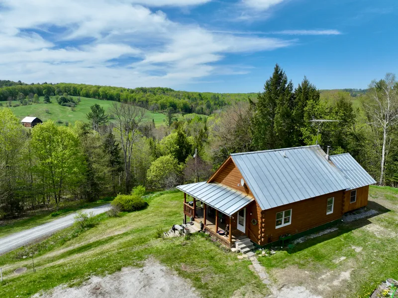 How many properties can advertise their own bridge over a babbling brook upon the entrance or departure from a dwelling? This property is comfortably situated up on a hill looking west into Ryegate, Vermont, with 10.10 acres of continuous land and plenty of indoor/outdoor living space to enjoy time away from work or to work from home. The convenience of cell phone service is available, as well as high-speed internet and other utilities from Witherspoon Road. The Log home has received a charming addition which provided a primary bedroom and a designated laundry space on the first floor. The kitchen provides ample storage space and work space, with a separate dining area closer to the living room. The loft above the first floor living space is a bedroom and has carpeted flooring to reduce noise. The basement walks out into the yard and has potential to be finished into more living space. The basement houses a pellet stove which is efficient and provides ample storage space to keep the upper level clear of totes, tubs, etc. Sitting on the covered porch looking at the view, utilizing the small campsite to roast marshmallows or hosting gatherings, this property provides a canvas for whatever your vision may allow.
