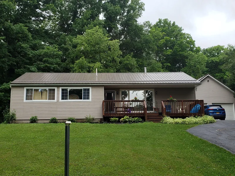 PRICE REDUCED! A captivating and brightly updated ranch on a private ~1 acre lot lined with mature shade trees and easy to care for landscaping located in the Cazenovia School District. This home is basically new from top to bottom, tastefully renovated throughout, with an open flow through kitchen, dining, and family room areas and contemporary farmhouse details. There is a master bedroom and two additional bedrooms as well as a well situated office providing a comfortable and private work at home space or an extra bedroom if desired. The completely renovated kitchen features all new: stainless steel appliances, charming glass front cabinets, a large pantry, luxury vinyl plank flooring, contemporary light fixtures and custom made ash countertops. Enjoy your meals in the dining room overlooking the beauty of the natural woods behind your backyard through the new Pella 9’ glass sliding door, while a wood stove adds additional cozy warmth to the open living areas. A large picture window in the front of the living room adds plenty of natural light to show off the rich, recently refinished oak hardwood floors that run throughout the home. An entirely remodeled bathroom features a luxurious soaker tub with curved apron, new marble look 100% waterproof luxury vinyl flooring, a custom made vanity, and modern glass tile shower surround. The partially finished basement, rec room or man cave, provides an additional ~720 square feet of living space with newly installed waterproof luxury vinyl plank flooring and freshly painted walls, bringing the total living space in this home to 2,016 square feet. Sip coffee under the cover of the front porch watching the sun rise and then wind down at the end of the day enjoying the peace and serenity on your back deck or gathered around the firepit. There is an oversized, 1.5 story, 2-car garage with a workbench with power, and an additional separate 1 car garage, providing abundant space for vehicles, garden & lawn equipment with room for hobbies. The back yard area is discreetly fenced in for pets or children’s safety. Conveniently located five minutes from town, this wonderful home has been completely transformed in 2020 into a contemporary country retreat with an all new kitchen & bathroom, luxury vinyl flooring, new propane furnace, new plumbing, new water heater, new lighting, all new appliances including washer & dryer, new roofs on the house and both garages, and freshly painted throughout. There is a concrete septic tank which was fully pumped in the fall of 2019. There is a survey available as well. This house is filled with light from the many large windows, providing serene views of the woods both front and back; while the layout is both open at the same time as providing some definition to each space, so you get the best of both worlds. The house is easy to care for, just the right size and has lots of outdoor space with decks both front and back. The lovely home is located in a country setting; but still close to Caz, in a quiet and friendly, but respectful, neighborhood. Three miles to Cazenovia Lake, featuring outstanding fishing and boating/watersports, with public boat launch and park, Lakeland Park, community park is an ideal spot to host a picnic, catch a baseball game, or the kids play on the playground. Nearby Chittenango Falls State Park, 194 acres, offers picnic areas, fishing and hiking trails, including the main feature of the park - a 167 foot waterfall formed 10,000 years ago with a traile that winds from the top of the falls down to the bottom. Cazenovia offered a highly ranked school district and active community events. This is a beautiful home, with a total of over 2000 sf of living space, remodeled in 2020 from top to bottom, in a very desirable location. *Listing agent is related to Sellers.