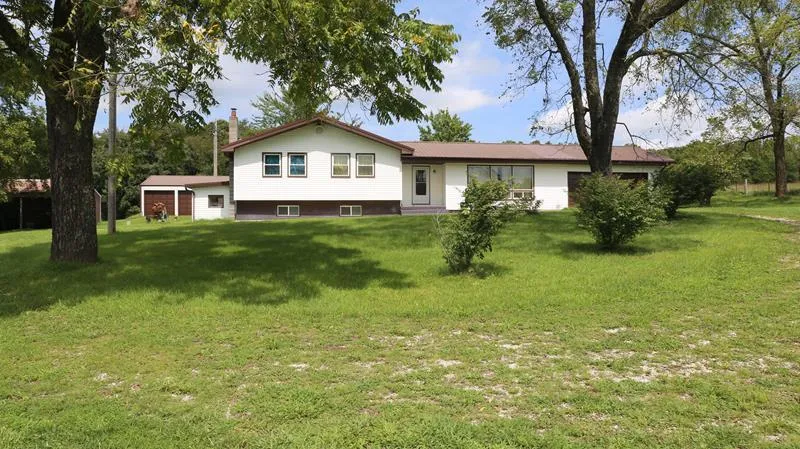 Missouri Ozarks home with finished walkout basement for sale in Houston, Missouri. The home offers 4 bedroom and 2.5 bathrooms, family room, and oak cabinets and Corian countertops in the kitchen. Theres an electric fireplace in the home and acreage for livestock on this Texas County property. The home boasts a 2 car attached garage, 3 car detached garage, and a 2 stall equipment barn for ample storage and workshops.