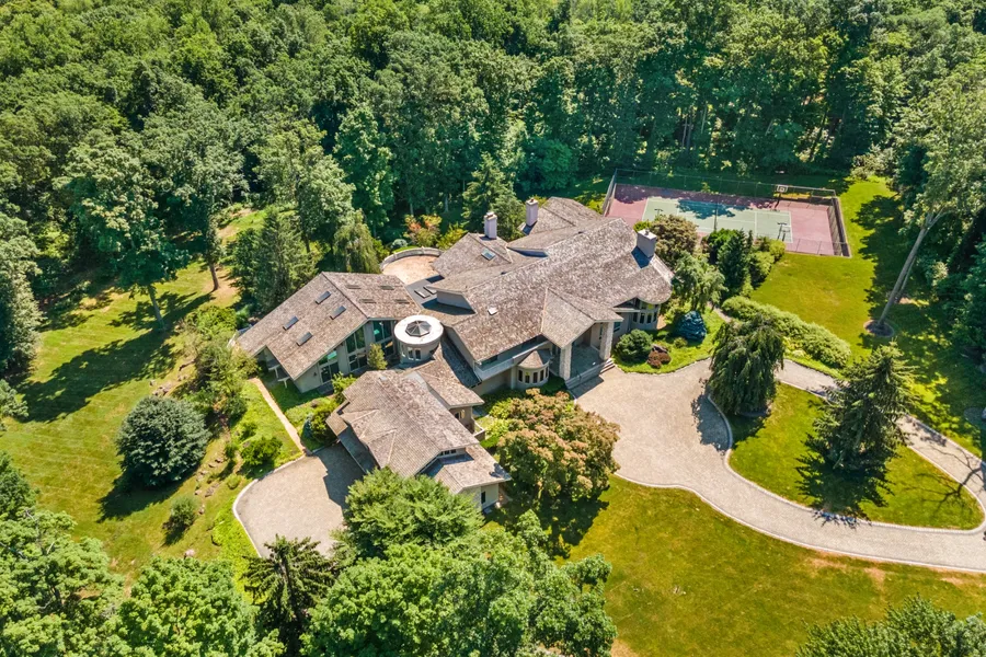 Vacation and work at home in sought-after Harding location. Grand space entered on expansive paver block driveway with courtyard. Incredible library/office, separate multi-generation living quarters, elevator to all three levels, Indoor 20 xc 40 heated salt-water pool with retractable cover, Covered and open stone balconies with lighted balusters. maintenance-free, fully lighted outdoor sports court, indoor golf simulator, restaurant quality mahogany bar with refrigerator, dishwasher, alcohol tap, controlled temp wine refrigerator, media room/theatre, ballet room/dance/exercise room and four-car garage with heated floor, three electric charging stations. 800 gallon Koi pond, whole house generator. Five year old hand split preservative treated cedar shake roof. Private, spiral staircase from master suite to second floor bedroom/office. All furnishings in the home are included in the sale. Gallery/Loft Lounge on Upper Level overlooking entry foyer and great Room.
