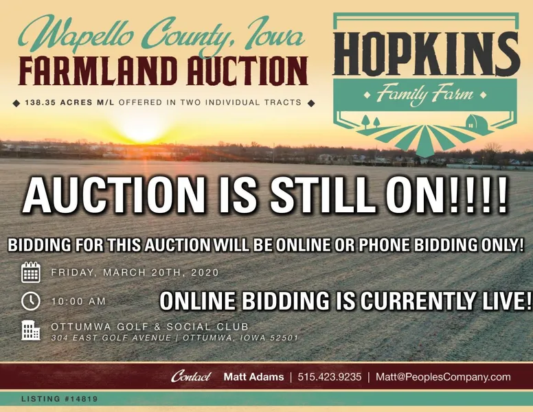 The Hopkins Family Farm Auction consisting of 138.0 surveyed acres will still be taking place on Friday, March 20th. However, bidding for this auction will take place through Online or Phone Bidding ONLY. There will be a group of licensed Peoples Company agents at the Ottumwa Golf and Country Club to work with Bidders and help facilitate placing a bid. Please contact Matt Adams at 515.423.9235 or by email with any questions about the auction or how to bid on this property.