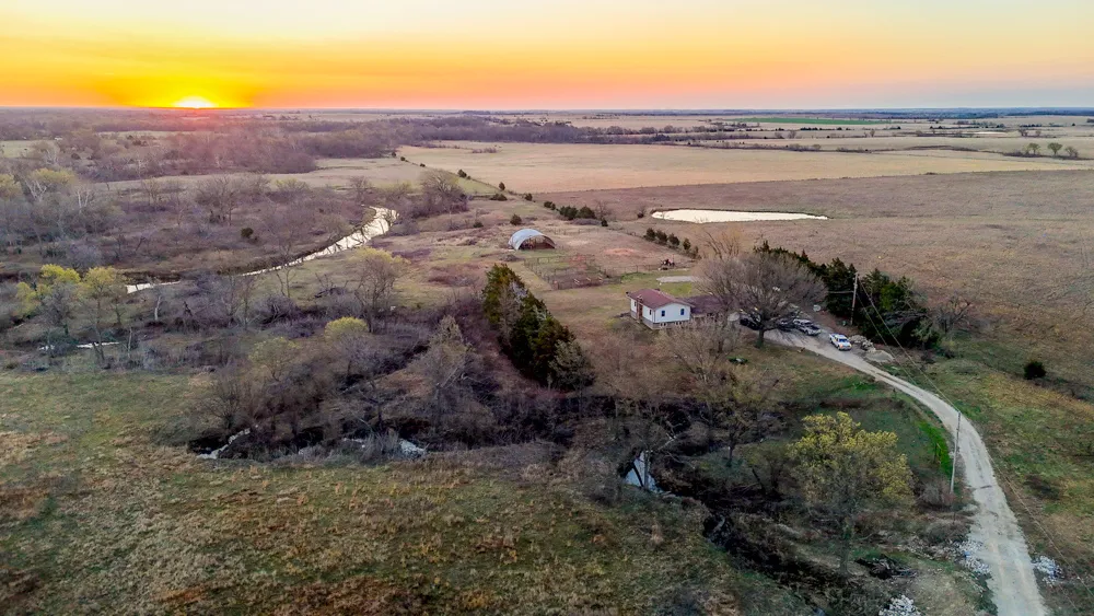 This beautiful home and 38 +/- acres sit in Woodson County, Kansas, off Highway 75 between Buffalo and Yates Center, Kansas. The property boasts an updated home, pasture, timber, creek, and a horse arena.