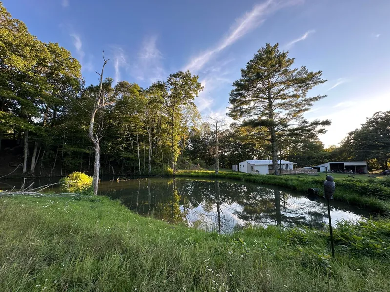 Escape to a cabin & 77+ acres of Natural beauty featuring a gorgeous spring-fed pond stocked with trout, carp, bass. This rare property offers the perfect balance of open farmland (approx. 20 acres) and serene woodland teeming with wildlife. Enjoy sweeping views, total privacy, and yet be only 3/4 mi. off Rt. 219/Seneca Trail. A cozy 1-bedroom cabin/camp welcomes you with a warm, inviting living/kitchen area and laundry/mud room. Recent updates include a newer septic system and a new tin roofmaking it easy to maintain or winterize for seasonal use. The land itself is rich with fruit trees, blackberries, mushrooms, and abundant wildlife. Outbuildings include an equipment shed and several well-kept storage barns, perfect for preserving the farm's organic harvestmaple syrup included!
