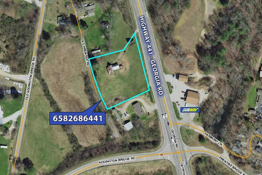 Great commercial location near intersection with traffic signal.1.35+/- UNRESTRICTED acres Direct access to US441 South and Old Prentiss Road. Water, Sewer and Gas available. Old farmhouse on property is of no value.