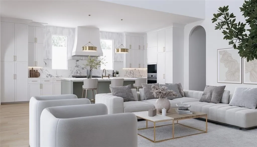 Step into a sunlit open-concept floorplan highlighted by soaring ceilings, clean lines, and an effortlessly refined palette. The chef’s kitchen is a true showpiece—anchored by a generous island, custom cabinetry, designer lighting, and professional-grade appliances—flowing seamlessly into an inviting living area perfect for entertaining or everyday comfort.