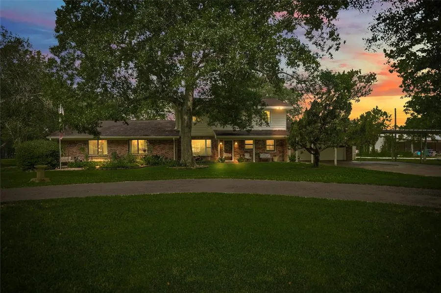 A gorgeous home & property for your family. Home was built with so many upgrades. A chef's dream kitchen with double ovens & custom cabinets. The view out the back is so peaceful with mature oak & fruit trees on the property, manicured flower beds, outdoor seating area. All of this country living & still just minutes from the main roads, schools & stores. The kitchen has an oversized, Built-in refrigerator stays & an enormous island with additional sink. The master bedroom has its own balcony. The extra-long driveway with circle driveway & front oak trees mean you'll pinch yourself when driving into your driveway. With a long driveway-you can have the whole family over for holidays. There's a family game room & formal living room for entertaining-although everyone will want to be outside playing basketball or volleyball. A low tax rate of 2.13 & no flooding here. Fruit & Pecan trees. There is a metal building that is 2000 sq ft with 2nd floor loft, and additional custom shed.