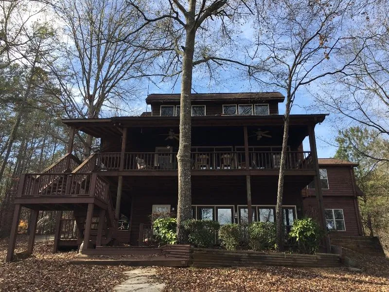 Large lake home with space for everyone to enjoy family time at the lake. This great home features a long driveway and sits on 1.38 acres with 113 feet of year round water frontage. At the shoreline there is a two story dock with a sun deck and a boat slip. This property has 5 bedrooms and 4 baths which includes an apartment above the 2 car garage complete with its own kitchenette. This space would make for great rental income or an in-law suite. Inside the home the kitchen is open to the living room with a rock fireplace, hardwood flooring, and double doors that open to a covered deck overlooking the lake. There is a large bedroom and full bathroom also on the main floor. Upstairs you will find two more spacious bedrooms and a full bath. On the upper level, there is a deck leading to the apartment. The terrace level features a large rec room, another bedroom, and the laundry room. Steps lead from the home to a patio area that is perfect for enjoying views of the lake. This home in conveniently located close to the marina in the no-wake zone.
