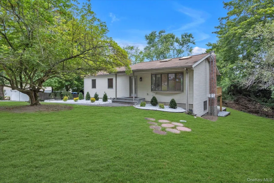 Hauppauge, Location, Location, Location! This fabulous Ranch-style home features lots of updates, is set back from the road and located with-in a desirable Cul de Sac on a sprawling .75 acre property. Enter the home thru the welcoming Entry Foyer that leads into the Formal Living Room with dramatic soaring/cathedral ceiling, 2 Skylights, hardwood floors and large Andersen, bay window over-looking front property. The Living Room flows into the Formal Dining room creating a relaxing entertaining area with open floor plan. The bright, NEW Stunning Eat-In Kitchen features White cabinetry, Quartz Counter tops, updated stainless steel appliances, beautiful tile backsplash, expansive window over-looking the scenic backyard and door to the convenient, outside deck. Continuing on the first floor is the Primary Bedroom En Suite with full bathroom, Closet w/built-ins, plus 2 addl Bedrooms w/closet built-ins and Hall Full Bathroom. Hardwood floors thru-out most of the 1st floor. The light filled lower-Level features a walk-out Family Room, wall of windows and sliders leading out to the backyard and patio. The center piece of this large Family room is a stone-faced fireplace that creates a warm and inviting atmosphere, perfect for cozy evenings. Lower level also features 2 large storage closets, convenient Laundry Rm/Powder Room and Entrance into the 2 Car Garage and Utility Rm. The gorgeous, oversized 3/4 acre property is landscaped and backyard features paver patio, entertaining and play areas plus plenty of room for a pool. Additional amenities include Central Air Conditioning, Andersen windows, Skylights, High Hats, Bedroom Closets w/custom built-ins, Updated 200 amp electrical service, updated burner and hot water heater, plus more! Taxes $11,400! This home is the perfect blend of function and comfort-don't miss your chance to make it yours!