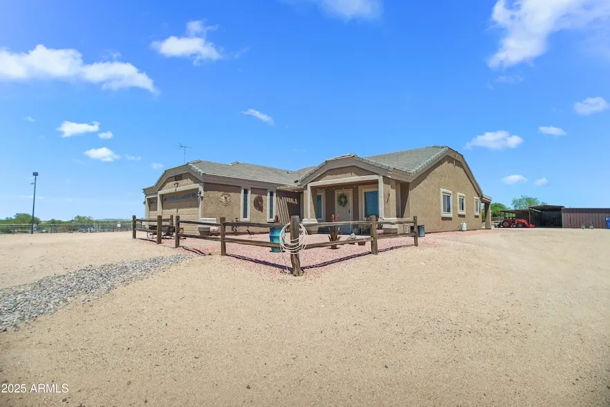 Welcome to your equestrian paradise in Desert Hills! This beautiful, newly renovated 3-bed, 2-bath home with a 3-car garage sits on 3.6 fully fenced acres, offering privacy and direct access to state land on two sides. Home has been thoughtfully updated over the past two years, featuring a brand-new kitchen, both bathrooms remodeled, and new flooring throughout. The property is a dream for horse lovers, boasting a 255' x 120' arena, 120' x 55' turnout, and two mare motels with a combined 23 stalls. Additional features include an 80' x 23' RV cover, a detached oversized 2-car workshop, multiple RV hook ups, and ''Club House'' complete with its own half bath and laundry. With easy access and beautiful views this unique horse property combines modern living with true Western charm.