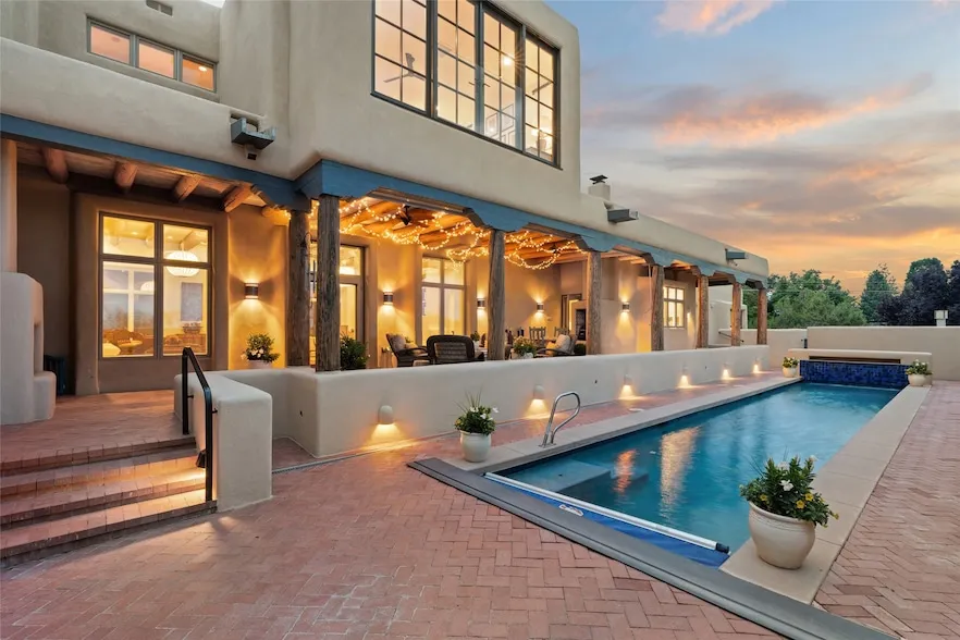 This distinguished and tranquil adobe was meticulously and fantastically remodeled in 2021 with an eye for opulence. This home was showcased in the esteemed 2022 Parade of Homes and won an award for Best Kitchen. The home boasts luxurious finishes throughout, including 7 majestic fireplaces, soaring ceilings, and rich acacia wood floors. Natural light cascades through oversized windows, enhancing the ambiance of every room. Spanning approximately 6,184 sq. ft. and nestled on 1.4 acres, this residence offers 100 miles of captivating views of the Ortiz and Jemez mountains. Within its walls, an array of spaces beckon, from an art gallery to a sunlit sanctuary, a chef s kitchen, an office on the mezzanine level, and serene retreats that seamlessly blend grandeur with intimacy. There is a sophisticated butler s pantry adjacent to a formal dining room. The primary suite, occupying its own private floor, offers dual bathrooms, spacious closets, an office enclave, and a deck. Meanwhile, guests can enjoy two distinctive bedroom suites. Accessed from the kitchen and great room, the outdoor portal is ideal for entertaining and overlooks one of the few lap pools in Santa Fe. With its tranquil and luxurious features, this home offers a turnkey haven for those seeking refined living. For your comfort, there is central air-conditioning and forced air heating, a 3-car garage with a storage room, and a potting/craft room as a bonus. Experience the splendor and tranquility just 5 minutes from downtown!