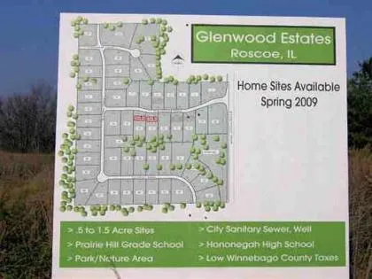 Glenwood Estates Subdivision in Roscoe IL 39.03 BUILDABLE ACRES WITH 18 PLATTED LOTS INTENDED FOR $300,000+ HOMES. PRIVATE WELL, SANITORY SEWER, PRAIRIE HILL GRADE SCHOOL, HONONEGAH HIGH SCHOOL, .5 TO 1.5 ACRE LOTS PARK/NATURE AREA. The assessed value listed is for 16 of the 18 unimproved lots, one at 797.00 and one at 807.00