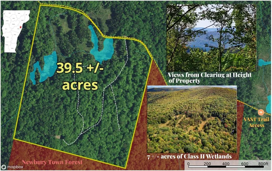 Imagine yourself nestled in a secluded off-grid home or camp, set high above your neighbors on this wonderful 39.5 +/- acre wooded lot in Newbury, VT. Experience gorgeous westerly views overlooking the nearby hill. There is an excellent driveway that winds through the property and leads to a small clearing at the height of the Land. With an existing artesian drilled well already on-site, the clearing could make an ideal spot for a camper, tent platform or remote homesite. Access to the property is off a privately maintained legal town trail. About 300 +/- of Forest Trail currently requires a high clearance 4WD vehicle to be passable, but with a little bit of road work, a camper should easily be able to be brought to the property. No soil testing has been completed for septic feasibility; buyers to conduct their own due diligence. A great place for your future remote getaway offering year-round recreational possibilities just minutes from your doorstep. Hunters & outdoorspeople will enjoy the 7 +/- acres of private Class II wetlands & 115 acres of adjoining public land. The VAST snowmobile trail is accessible off Forest Trail just a short .4-mile ride away. The property is enrolled in Vermont Current Use with 2-acres conveniently excluded for a future potential homesite. See the Forest Management Plan here. Ideally suited for off-grid power due to its remote location. Less than 20 minutes to the US-302 & I-91 corridors for easy travel to & from the property. Come find peace & quiet in Newbury!