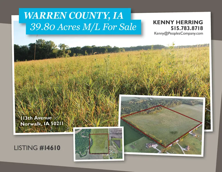 Located just outside of the Des Moines metro in Warren County lies this beautiful and diverse executive building site location. With views worthy of a postcard and the income to justify the investment, this unique property offers just about everything you could ask for. The property totals 39.8 acres and contains approximately 32.37 acres of CRP that offers an annual income of approximately $9,050. The CRP fields include a beautiful mix of wildflowers, grasses, and forbs hosting a high population of pheasants. Remaining CRP contract payments total over $45,000 setting the new owner up for an excellent long term investment. The North River meanders the west side of the property which is lined with timber. There are numerous wildlife trails throughout the timber that indicate a healthy population of whitetail deer and wild turkey. This tract of land is 5 miles from the growing city of Norwalk, 10 minutes from Des Moines International Airport and a stone's throw from the Des Moines City limits. Utilities are conveniently located and readily accessible. Whether you are looking for the perfect building site, or just looking for a playground close to the metro, this property is the perfect investment opportunity.