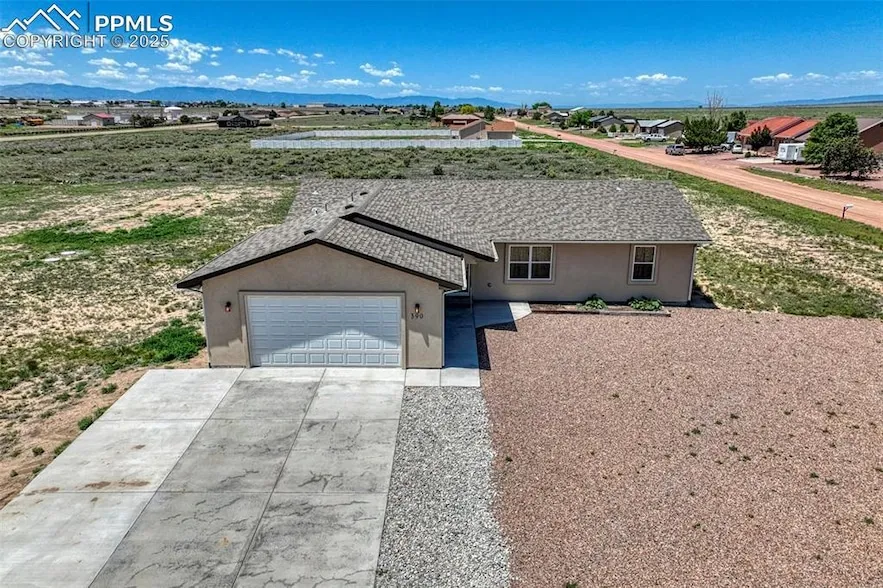 This well-crafted, nearly new single-level home on over 1 acre boasts an open-concept design, linking the entry, living area, dining space, and kitchen, and accessible features at the entry, master bath and garage. The kitchen is a highlight, with upgraded white cabinets, granite counters, a corner pantry, side-by-side refrigerator, gas range, and premium upgrades like crown molding, with a walkout to the 56x14-foot patio with uninterrupted views of the mountains and Pikes Peak. The split bedroom design offers extra privacy, placing the master bedroom near the kitchen, complete with a luxurious bath with granite counters, separate vanities, a soaking tub for relaxation, stall shower, and 10x10-ft walk-in closet. Two more generous bedrooms share a beautiful full bath that also features granite counters. There is just one step at the entry and from the garage to the spacious mudroom and laundry offering accessibility and comfort. The serene location on a corner lot near the renowned Walker Ranch offers unlimited opportunities, including room for horses, a separate shop or studio, and RV parking. The oversized garage has an 8 ft door and ample space for a full-size truck- plus room for all of your essential gear. All this, plus enjoy Pueblo West's mild climate averaging over 250 days of sunshine per year, nearby walking trails, as well as fishing and boating opportunities at nearby Pueblo Reservoir, with the convenience of shopping and restaurants just around the corner.