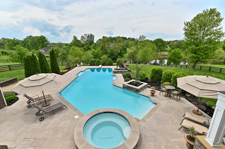 This impressive 6 bedroom, 4 1/2 bath home sits beautifully on a one acre lot with breathtaking views of the small community lake. It has been completely updated with modern farmhouse details throughout. Enjoy the outdoor oasis with a heated saltwater gunite pool and hot tub just in time for summer! The open floor plan makes the home ideal for family gatherings or entertaining. The main floor features a formal dining room, open kitchen/great room with wood burning fireplace (gas logs), laundry room, half bath and primary suite with updated bath and custom walk-in closet. Enjoy the outdoors from this level on your covered porch and Brazillian hardwood deck. The modern metal stair railings lead you to the second level featuring 3 bedrooms, a bonus room and 2 full baths. The lower level. walkout includes a family room with gas fireplace, entertaining area with dry bar, 2 bedrooms and full bath. Walk right out to the covered patio and limestone pool deck. Here you'll find the 50' long pool with 2 swim-out seats, 2 waterfalls and 8 deck fountain jets. The hot tub overflows into the pool for a true spa-like experience. In addition to the attached 3 car garage, there is a 2 car heated garage with lower level for pool equipment and storage. You won't want to miss this opportunity to own a like-new construction home in Oldham County. Only 30 minute drive to to downtown Louisville.