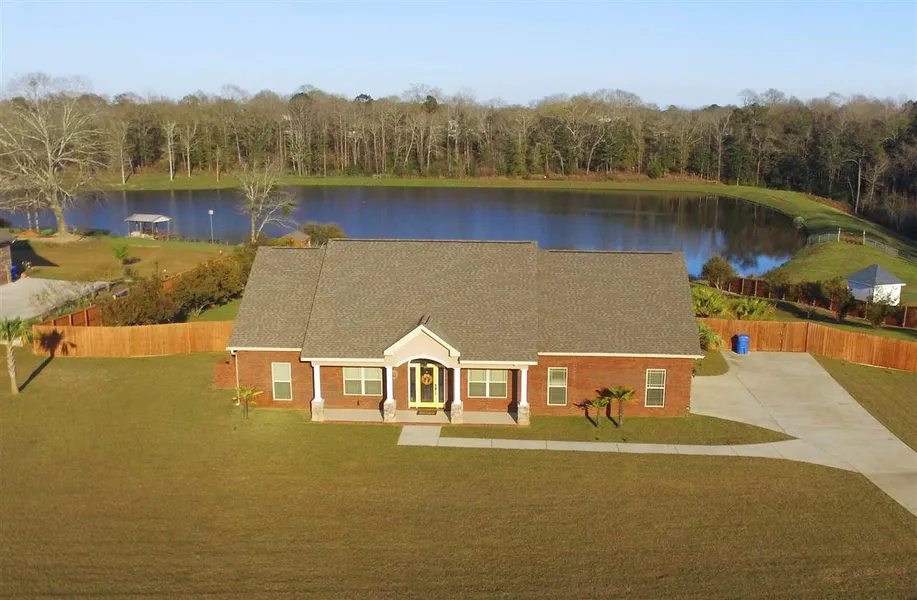 Beautiful lakefront home on over 2 acres feels like a resort! Spacious 4BR open concept. Huge master bedroom suite; shower with 3 heads, jacuzzi tub, massive closet. Security system with video monitoring, surround sound system, keyless entry. Handscraped wood floors, custom cabinetry, and granite counters. Bonus room could be 5th bedroom. Large enclosed porch with TV and fireplace overlooks courtyard patio, 18x40 saltwater pool surrounded by palm trees, and a stocked lake. Oversized garage and 10x16 shed.