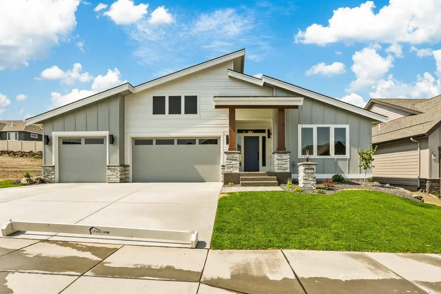 This is a new Paras Homes subdivision called Trickle Creek North. This is the Adams plan in a private cul de sac on the South Hill. Custom kitchen with painted cabinets, quartz counters, double oven appliance package, and walk in pantry. Wood floors through the entryway, kitchen, dining area, and great room. Three bedrooms, an additional office, and two bathrooms. Great room includes full ceiling height stone, modern linear fireplace and built in cabinets. Beautiful, stained ceiling beam. Large, covered patio. Large 978 SF, 4-car garage. Complete yard landscaping front and back. Great modern exterior look. Will be completed around middle of May. Lbx on front door.