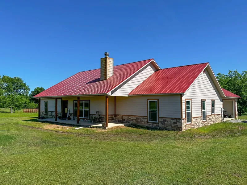 Except here at Peavine Creek it does, because not only does this ranch have the ideal natural features, but it also has a three-year-old home and barn perched at the transition from the hillside to the creek bottom and just east of the lake. This four-bedroom, two-bathroom home was completed in 2021 and features a master suite with large bathroom on the west end of the house and three more bedrooms and a second bathroom on the east end. In between is an open floor plan living room, dining room and kitchen with a shared cathedral ceiling. The living room has a stone fireplace with a wood stove insert. The combination of good insulation, high efficiency wood stove and pecan wood yields free heat and the comforting aroma that you get from a fire. A large back porch doubles as a spot for hosting parties and outdoor recreation. It would be a pleasure to enjoy relaxing here during the evenings. There is also an attached garage equipped with an above ground storm shelter. There is also a new barn that has plenty of room for storing hay, equipment, trailers and even has an area for riding horses that is partly covered. The electric service was installed underground to avoid disturbing the beautiful view with overhead lines.