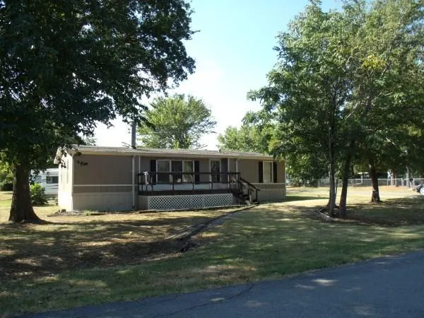 Large, treed corner lot with updated DW MH & Storage Building. New floor covering, blinds & floor vents. New countertops, dishwasher & vent hood in kitchen. Main bath has new tub, vanity, faucets & mirror. All bedrooms have large closets. Master has 2 walk-in closets. Living room has tons of built-in storage & shelves along with a wood burning fireplace.6x20 front porch & 12x16 deck on back and a 15x25 storage shed suitable for multiple uses. Concrete sidewalk from back deck to shed. Onwer fincaning available!
