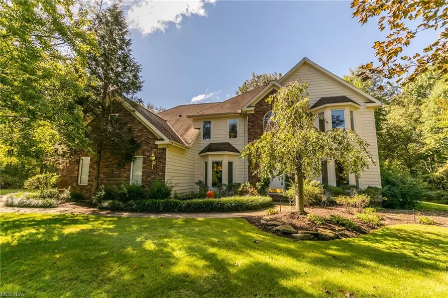 This Chagrin Highlands home is thoughtfully set on over an acre of nature's best offerings. Clearly at home here, nature graciously welcomes you daily with her unique ambiance, surrounding you with mature trees and the symphony of her song. This spectacular setting is invited inside by the plethora of windows that highlights the allure of this home. The floor-to-ceiling wall of windows in the immense great room boasts new carpet, fresh paint and a stunning stone-stacked fireplace. This is one great room that is sure to find you making many wonderful lifetime memories. Adjacent to the great room is a delightfully spacious kitchen that hosts a massive granite island, walk-in pantry, TRUE wooden cabinetry and plenty of room for a full table. Again, the views of nature are abundant as windows detail this kitchen space as well, including a full windowed access alcove to the expansive back deck. The first floor is rounded by a half bath, formal dining room and living room and office. The office is classic in it's wooden decor and highly functional with loads of cabinetry perfect for an organized filing of everything important. Upstairs the master bedroom sports a vaulted ceiling and an en-suite bath. Bath features a soaking tub and walk-in closet and intricate ceramic tile work. The remaining three bedrooms are all attached to a full bath. Perfect for guests or a growing family! The basement is beyond massive and with over 1700 sq/ft, there is room for any build-out imagineable.