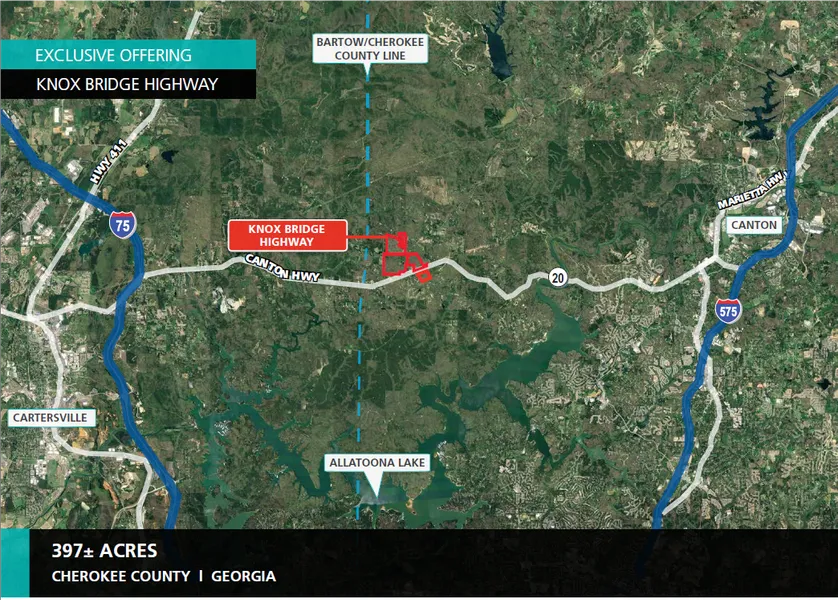 397 +/- acres on Knox Bridge Highway in Cherokee County. The property allows for a large development that may consist of multiple price points and offering a prime opportunity to enter into or expand within this market.