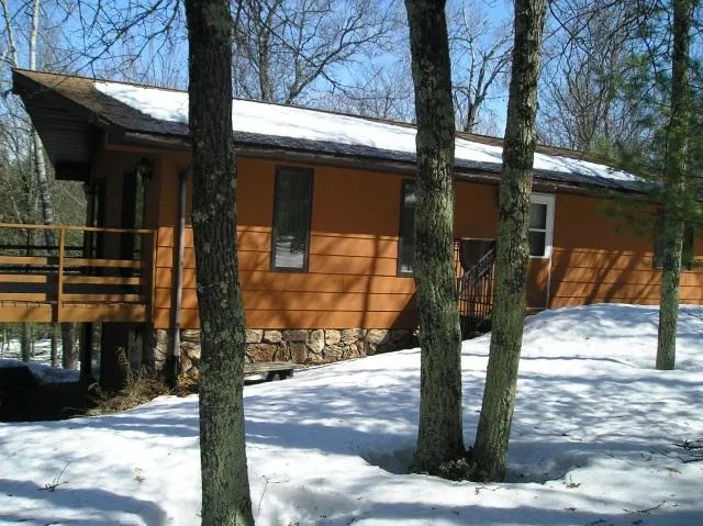 Very private exceptional 4 acre wooded lot with western exposure on deep crystal clear lake with sandy swimming shoreline. Cedar sided lake home with prow front is finished up and down; open floor plan, carpet floors, pine walls. Comfortable living area. Two bedrooms up, bath. Rec room with wet bar. Extra sleeping area and utility and laundry in lower level. Walk out to patio and stairs to lakeside. All electric home. Pines and oaks around home and garage, interesting curved driveway.