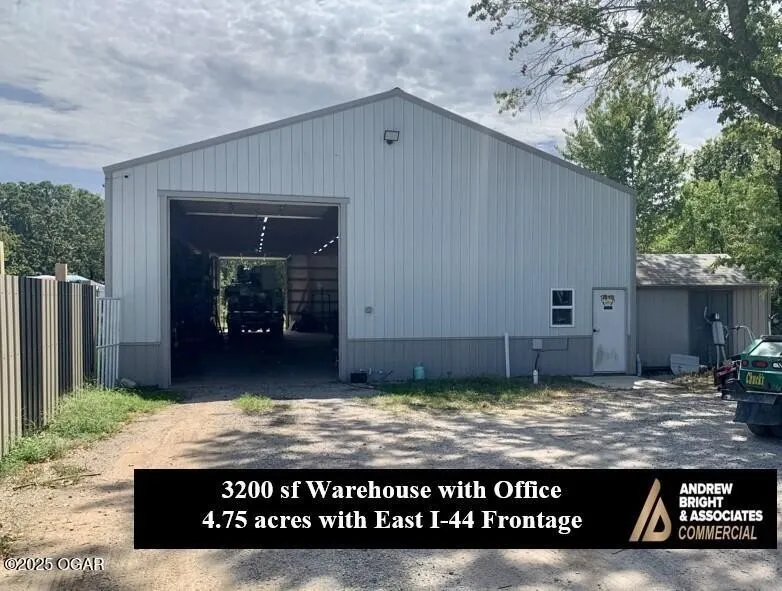 3200 sf warehouse with I-44 east frontage on 4.75 acres. Located outside the city in Newton county with City Water, Liberty Electric and Septic. Office/bathroom area has full climate control. Large containment area east of the building. Containment area has a power gate featuring remote notification when opened and closed. Approximately 3.5 acres of surplus ground for expansion or inventory See MLS #255832 for one acre ground and warehouse listing