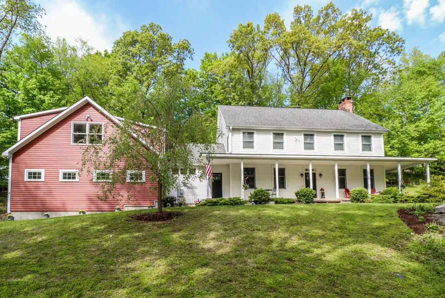 Back and better than before...adding an upper level full bathroom, this beautiful farmhouse colonial now hosts 2.5 baths. A welcoming wrap-around porch is the perfect introduction to the remarkable interior of this custom-built Colonial Farmhouse. This stunning home has a wealth of space for daily living & special gatherings. The spacious open-design floor plan on the main level promotes a casual, informal lifestyle. A foyer/sitting room leads to a living room w/brick fireplace, then opens to the dining room w/built-in hutch & sliders to porch and then flows to the beautiful, one-of-a-kind kitchen. An office/mudroom and powder room complete the 1st floor. Upstairs includes a primary bedroom with private full bath. Also, 3 additional generous sized bedrooms, all w/ceiling fans and share a brand new (2022) hall bathroom. The property's versatile layout also includes 2 expansive, unfinished areas (the 3rd floor attic & above the garage) which can bring additional living space and the potential for multi-generational accommodations. Two photos have been virtually staged to help envision how those spaces could be built/utilized. Nestled amid a wooded area, the 1.19 private acres is enhanced w/a stone patio & outdoor fireplace, stone walls, split rail fence, & walkways. Enjoy the fresh air and quiet surroundings of Ashleigh Lane and the convenience of a central location.