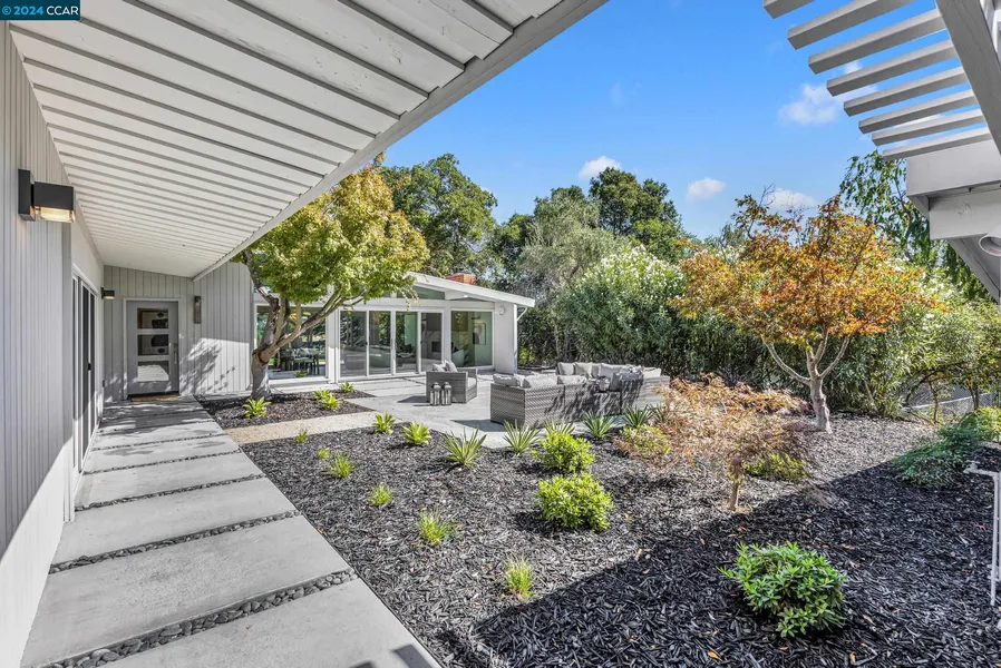 Completely remodeled & restored mid-century modern stunner sits on a cul-de-sac the Orinda Hills. Just minutes from downtown Orinda, Bart & highway 24. A private courtyard welcomes you to the home as you approach the front door. The open concept living & dining room has wall to wall windows & slider doors looking out onto the courtyard, the backyard & the views of the hills. The dining room is situated just off the kitchen. The kitchen has been completely remodeled with a large island, coffee station, wine bar, luxury appliances & custom cabinetry. A breakfast nook & island lead you to the cozy second living room. Down the hall you will find a half bath & laundry room before making your way to the two spare bedrooms & its shared hall bath. At the end of the hallway is the primary suite with its spacious shower under a skylight & double sink vanity. In the backyard is a detached studio style ADU with a full kitchen & bathroom. The ADU also has its own private deck off the back. The backyard has a large grass area with large pavers outside the home, perfect for outdoor dining & entertaining. Spectacular views of the hills. In front of the home is a detached two car garage with plenty of room for storage or a workshop. 2nd detached parking & storage area at the end of the driveway.