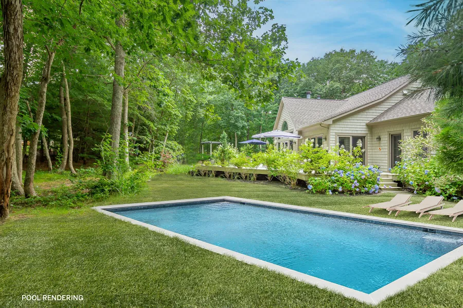Interior designer's own custom-built, stylish contemporary is located just off Gardiner's Bay in East Hampton's prestigious and tranquil Landfall community. With a beautifully conceived floor plan for easy indoor/outdoor living, the open layout features a central living space with soaring cathedral ceilings flanked by two bedroom wings: a private guest wing with two en-suite bedrooms and a primary suite wing with two walk in closets and a spa-like bathroom with Jacuzzi. A sunny den with full bath with steam shower could easily convert to a fourth (legal) en suite bedroom and a large rear deck runs the length of the house in the peaceful and exquisitely landscaped, lit and fenced back yard. Over 2000 sq. ft. of unfinished basement with egress and 8' ceilings are awaiting finishing and the pool envelope is staked by surveyor and awaiting your dream pool design. High-end fixtures and architectural details abound, from lighting to appliances to striking design finishes. In the backyard, two bluestone patios with fireplaces complete the easy breezy Landfall lifestyle in this stunning, casual, Hamptons style home.