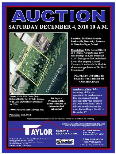 Description: 4.032 Acres (Offered in 4 Tracts). All tracts have 100+` road frontage on Keen Street and 112+` frontage on the Cumberland River. This property is zoned Commercial and would be ideal for almost any type business! No Deed Restrictions!