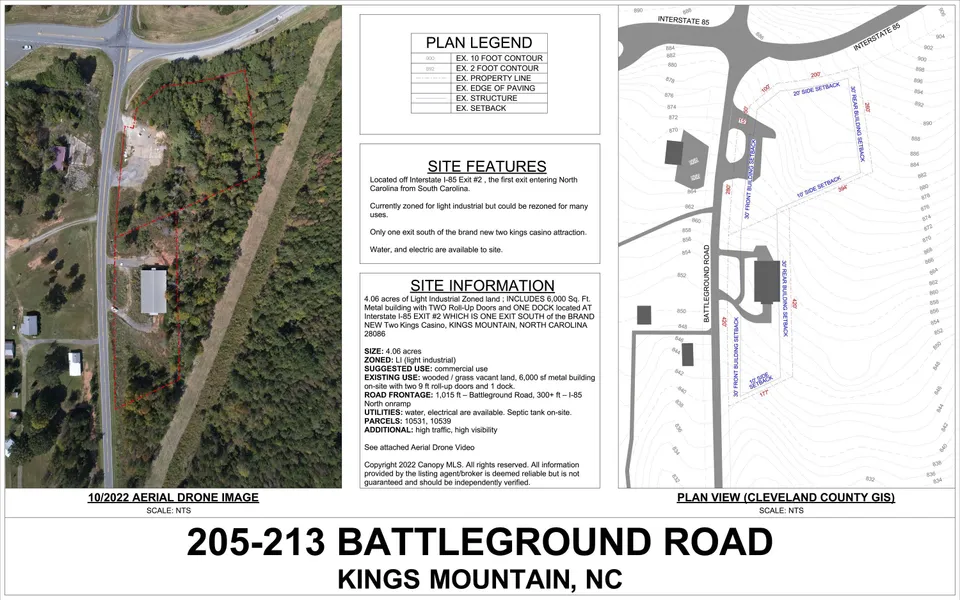205-213 BATTLEGROUND ROAD - 4.06 acres of Light Industrial Zoned land, However MANY uses available ; INCLUDES 6,000 Sq. Ft. Metal building with TWO Roll-Up Doors and ONE DOCK located AT Interstate I-85 EXIT #2 WHICH IS ONE EXIT SOUTH of the BRAND NEW Two Kings Casino, KINGS MOUNTAIN, NORTH CAROLINA 28086