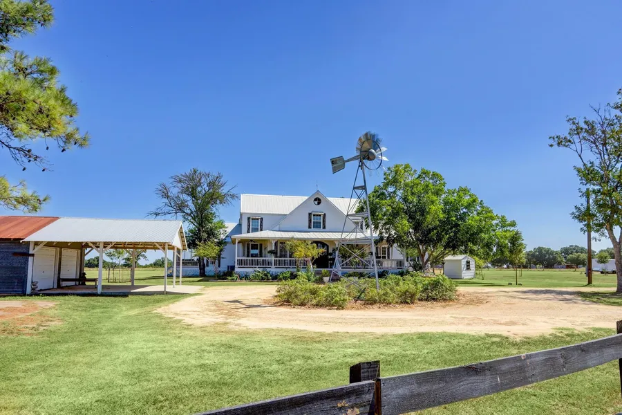 Fabulously remodeled and expanded 1890's farmhouse on just over 4 acres with views for days! The welcoming entrance leads you into this thoughtfully designed two-story home with high-ceilings, stunning staircase, open kitchen, dining and breakfast areas for friends and family to gather. The primary and one bedroom are downstairs with 3 bedrooms up. Tons of natural light stream in from the large windows throughout the home and a there's a porch for every breeze! The primary bedroom suite doesn't disappoint - a large bathroom, oversized shower, and expansive walk-in closet! This backyard escape is a welcoming place for guests with deck and a "she shed" that can used for so many things! Circular driveway w/beautiful landscaping & working windmill! This property would be a perfect forever home, second home, or vacation rental. It's just over 80 miles to Houston, 20 miles to Round Top and under 10 miles to The Falls and Big Easy Ranch.